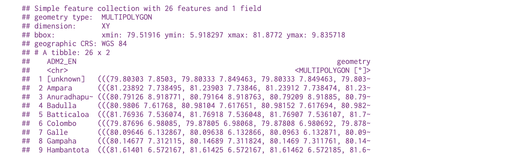 class: center, middle, inverse, title-slide .title[ # Spatial Data Visualization with R ] .author[ ### Dr Thiyanga S. Talagala ] .author[ ### ] --- ## What geometries do you see on the map? <img src="https://bookdown.org/lexcomber/brunsdoncomber2e/bookdown-demo_files/figure-html/Op2-1.png" width="80%" style="display: block; margin: auto;" /> --- # Geospatial Vector Data 1. Points: single (x, y) point 2. Lines: two or more connected (x, y) points 3. Polygon: three or more (x, y) points connected and closed --- ## Globe to Plane What do we want to plot? Globe - 3D Space Where do we plot? Computer screen or paper - 2D Space To define the location of objects on the Earth, which is round, we need a coordinate system that adapts to the Earth’s shape. --- # Coordinate Reference System (CRS) - the way in which spatial data that represent the earth’s surface (which is round / 3 dimensional) are flattened so that you can “Draw” them on a 2-dimensional surface. --- ## Components of CRS Coordinate system: X, Y grid to define a point located in space Horizontal and vertical units --- ## Why multiple CRS? To optimize to best represent the shape and/or scale / distance and/or area --- ### Maps of the United States in Different CRS <img src="https://thiyanga-spatiotemporal.netlify.app/posts/time_series/us.jpeg" width="70%" style="display: block; margin: auto;" /> Source: https://www.earthdatascience.org/ --- ### Human head projections using different CRS .pull-left[ <img src="https://thiyanga-spatiotemporal.netlify.app/posts/time_series/head.jpeg" width="90%" style="display: block; margin: auto;" /> ] .pull-right[ Source: https://www.earthdatascience.org/ ] --- # Shapefile - Vector data storage format for storing the location, shape, and attributes of geographic features - A shapefile is made up of three required files with the same prefix ('spatial-data' in this case) but different extensions: - spatial-data.shp: main file that stores records of each shape geometries - spatial-data.shx: index of how the geometries in the main file relate to one-another - spatial-data.dbf: attributes of each record --- ### CRS vs Shapefile - Shapefiles contain geographic vector data that is expressed in a particular CRS --- ## Map types .pull-left[ <img src="https://open.lib.umn.edu/app/uploads/sites/178/2017/07/Image076.jpg" width="90%" style="display: block; margin: auto;" /> ] .pull-right[ source: https://open.lib.umn.edu/mapping/chapter/5-simplification/ ] --- ## Sri Lanka ```r # install.packages("devtools") devtools::install_github("thiyangt/ceylon") ``` ```r library(ceylon) library(tidyverse) library(sp) library(viridis) ``` --- ```r data(sf_sl_0) ggplot(sf_sl_0) + geom_sf() ``` <img src="lecture7_files/figure-html/unnamed-chunk-6-1.png" width="100%" /> More information: https://github.com/thiyangt/ceylon --- # ozmaps package ```r library(sf) library(ozmaps) library(kableExtra) library(knitr) sf_oz <- ozmap_data("country") sf_oz %>% kable() ``` <table> <thead> <tr> <th style="text-align:left;"> NAME </th> <th style="text-align:left;"> geometry </th> </tr> </thead> <tbody> <tr> <td style="text-align:left;"> Australia </td> <td style="text-align:left;"> MULTIPOLYGON (((144.8691 -4... </td> </tr> </tbody> </table> --- ```r ggplot(sf_oz) + geom_sf() ``` <img src="lecture7_files/figure-html/unnamed-chunk-8-1.png" width="100%" /> ---  --- ## Tutorial: Visualizing spatial data https://tstdataviz.netlify.app/slides/spatiotemporal.html